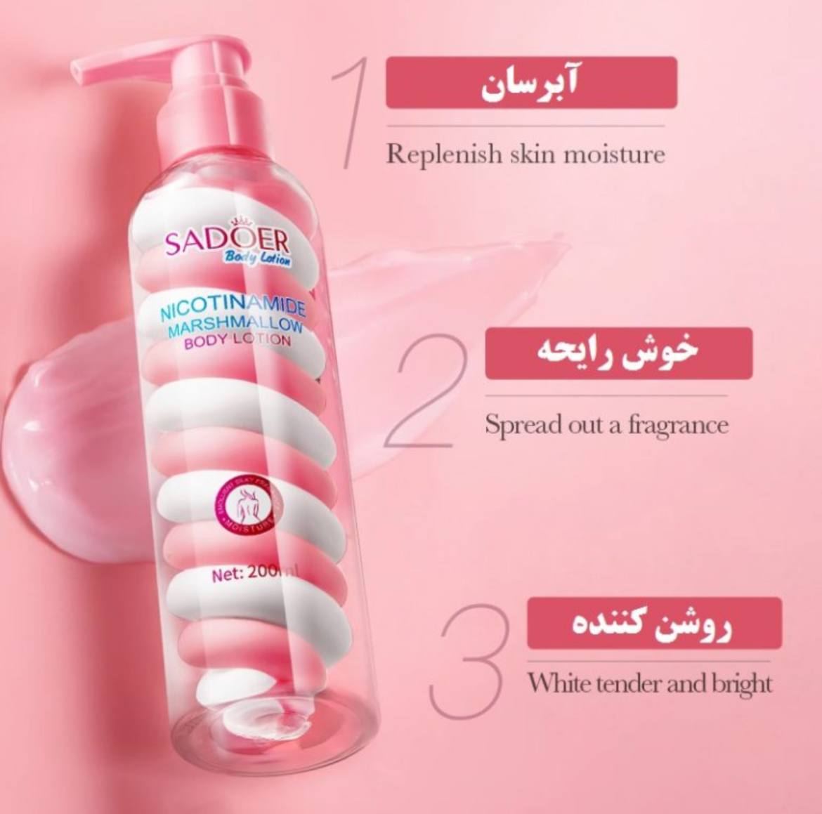 لوسیون بدن مارشمالو سادور، مناسب برای رفع لک و تیرگی های ایجاد شده بر روی پوست توسط UVA , UVB اشعه های فرابنفش نور خورشید بوده و نیز از تشکیل ملانین و لک های جدید جلوگیری می کند.
